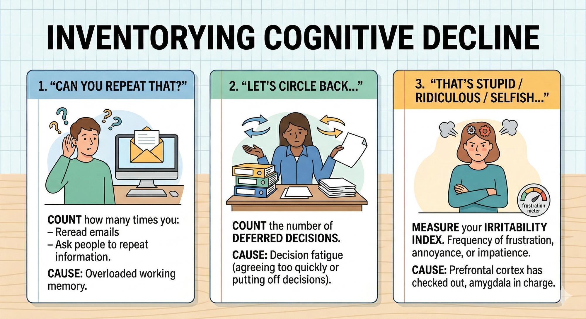 - "Can you repeat that?" Count how many times you have to reread an email or ask people to repeat information. Working memory is the first things to go when the brain gets overloaded.